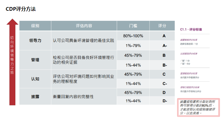 答:CDP评级从低到高分别为:披露、认知、管理、领导力级别,评分从D-到A,具体如下所示: